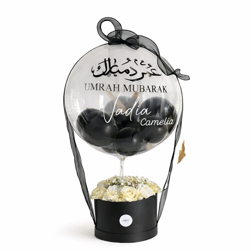 Composée de fleurs fraîches soigneusement sélectionnées et accompagnée d’un ballon personnalisé, cette box a été imaginée comme une attention sobre et raffinée, idéale pour marquer une Omra.